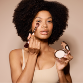 A mattifying, setting powder that helps combat shine and sets makeup. It is typically applied after foundation and concealer to create a smooth, seamless finish.
